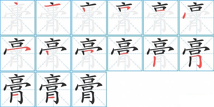膏是上下结构,膏的部首是“月”,部外笔画10画,总笔画14画,膏的笔画顺序是“点、横、竖、横折、横、点、横撇/横钩、竖、横折、横、竖、横折钩、横、横”。看看“膏”字什么意思 >>