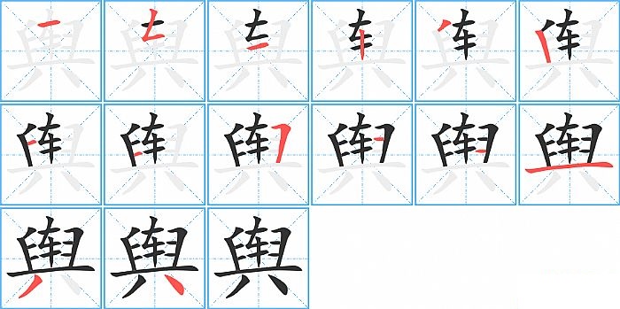 舆是上下结构,舆的部首是“臼”,部外笔画8画,总笔画14画,舆的笔画顺序是“撇、竖、横、横、横、撇折、横、竖、横折、横、横、横、撇、点”。看看“舆”字什么意思 >>
