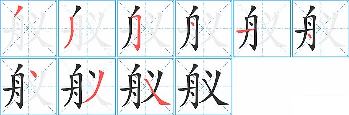 舣是左右结构,舣的部首是“舟”,部外笔画3画,总笔画9画,舣的笔画顺序是“撇、撇、横折钩、点、横、点、点、撇、捺”。