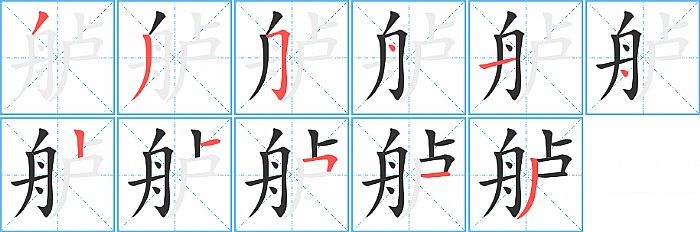舻是左右结构,舻的部首是“舟”,部外笔画5画,总笔画11画,舻的笔画顺序是“撇、撇、横折钩、点、横、点、竖、横、横折、横、撇”。看看“舻”字什么意思 >>