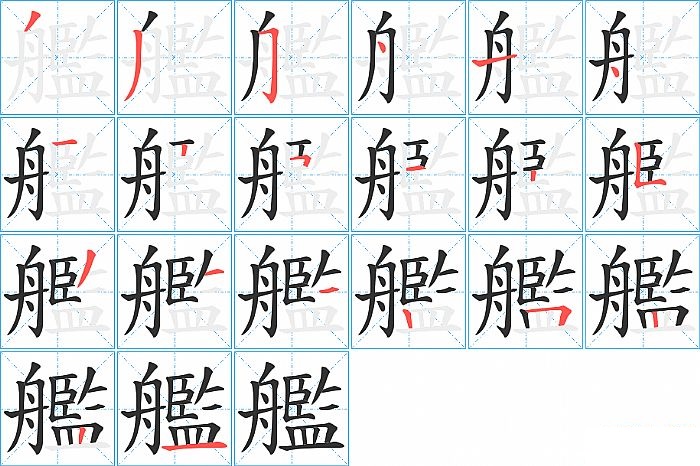 艦是左右结构,艦的部首是“舟”,部外笔画14画,总笔画20画,艦的笔画顺序是“撇、撇、横折钩、点、横、点、横、竖、横折、横、竖、竖折/竖弯、撇、横、点、竖、横折、竖、竖、横”。看看“艦”字什么意思 >>