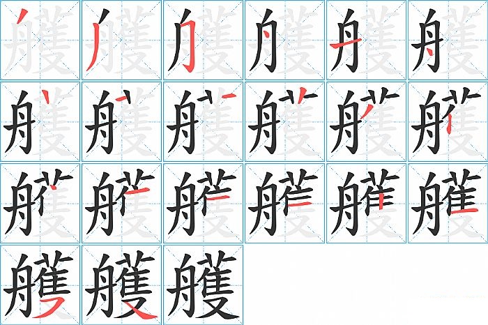 艧是左右结构,艧的部首是“舟”,部外笔画13画,总笔画19画,艧的笔画顺序是“撇、撇、横折钩、点、横、点、横、竖、竖、撇、竖、点、横、横、横、竖、横、横撇/横钩、捺”。看看“艧”字什么意思 >>