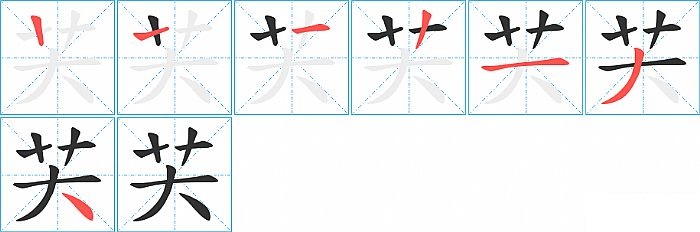 芖是上下结构,芖的部首是“艹”,部外笔画3画,总笔画6画,芖的笔画顺序是“横、竖、竖、横、撇、捺”。