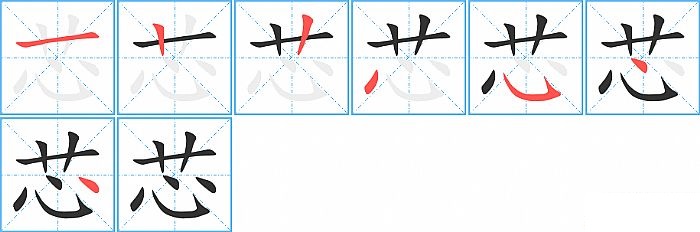 《芯》字的笔顺分步演示图(一笔一画写汉字)