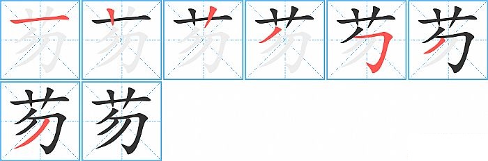 芴是上下结构,芴的部首是“艹”,部外笔画4画,总笔画7画,芴的笔画顺序是“横、竖、竖、撇、横折钩、撇、撇”。