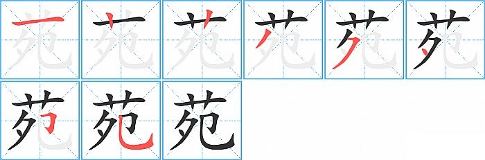 苑是上下结构,苑的部首是“艹”,部外笔画5画,总笔画8画,苑的笔画顺序是“横、竖、竖、撇、横撇/横钩、点、横折钩、竖弯钩”。看看“苑”字什么意思 >>