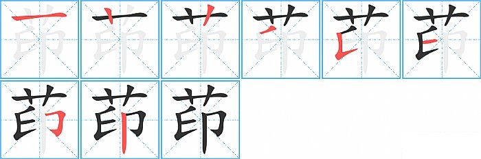 茚是上下结构,茚的部首是“艹”,部外笔画5画,总笔画8画,茚的笔画顺序是“横、竖、竖、撇、竖提、横、横折钩、竖”。