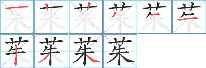 茱是上下结构,茱的部首是“艹”,部外笔画6画,总笔画9画,茱的笔画顺序是“横、竖、竖、撇、横、横、竖、撇、捺”。