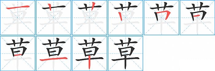 草是上下结构,草的部首是“艹”,部外笔画6画,总笔画9画,草的笔画顺序是“横、竖、竖、竖、横折、横、横、横、竖”。