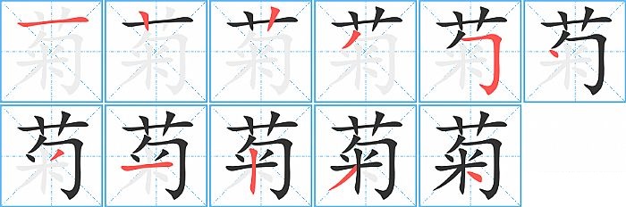 菊是上下结构,菊的部首是“艹”,部外笔画8画,总笔画11画,菊的笔画顺序是“横、竖、竖、撇、横折钩、点、撇、横、竖、撇、点”。看看“菊”字什么意思 >>