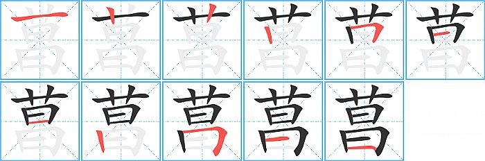 菖是上下结构,菖的部首是“艹”,部外笔画8画,总笔画11画,菖的笔画顺序是“横、竖、竖、竖、横折、横、横、竖、横折、横、横”。看看“菖”字什么意思 >>