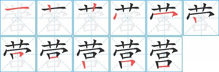 营是上中下结构,营的部首是“艹”,部外笔画8画,总笔画11画,营的笔画顺序是“横、竖、竖、点、横撇/横钩、竖、横折、横、竖、横折、横”。看看“营”字什么意思 >>