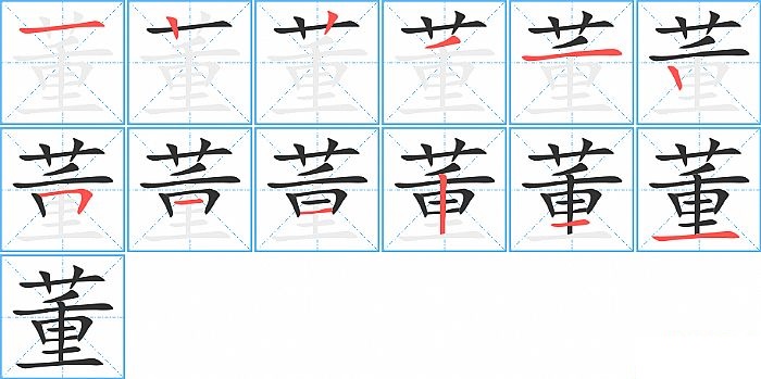 董是上下结构,董的部首是“艹”,部外笔画9画,总笔画12画,董的笔画顺序是“横、竖、竖、撇、横、竖、横折、横、横、竖、横、横”。看看“董”字什么意思 >>