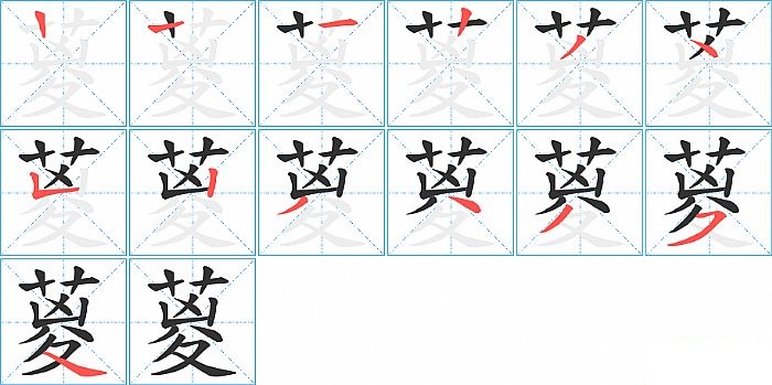 葼是上下结构,葼的部首是“艹”,部外笔画9画,总笔画12画,葼的笔画顺序是“横、竖、竖、撇、点、竖折/竖弯、竖、撇、点、撇、横撇/横钩、捺”。看看“葼”字什么意思 >>