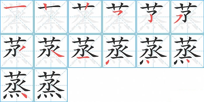 蒸是上中下结构,蒸的部首是“艹”,部外笔画10画,总笔画13画,蒸的笔画顺序是“横、竖、竖、横撇/横钩、竖钩、横撇/横钩、撇、捺、横、点、点、点、点”。看看“蒸”字什么意思 >>