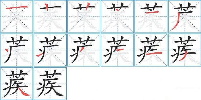 蒺是上下结构,蒺的部首是“艹”,部外笔画10画,总笔画13画,蒺的笔画顺序是“横、竖、竖、点、横、撇、点、提、撇、横、横、撇、捺”。看看“蒺”字什么意思 >>
