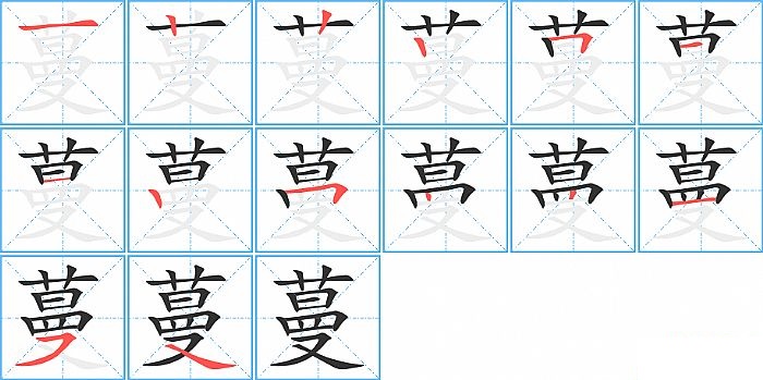 蔓是上下结构,蔓的部首是“艹”,部外笔画11画,总笔画14画,蔓的笔画顺序是“横、竖、竖、竖、横折、横、横、竖、横折、竖、竖、横、横撇/横钩、捺”。看看“蔓”字什么意思 >>