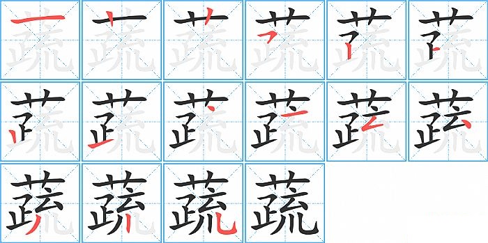 蔬是上下结构,蔬的部首是“艹”,部外笔画12画,总笔画15画,蔬的笔画顺序是“横、竖、竖、横撇/横钩、竖、横、竖、提、点、横、撇折、点、撇、竖、竖弯钩”。看看“蔬”字什么意思 >>