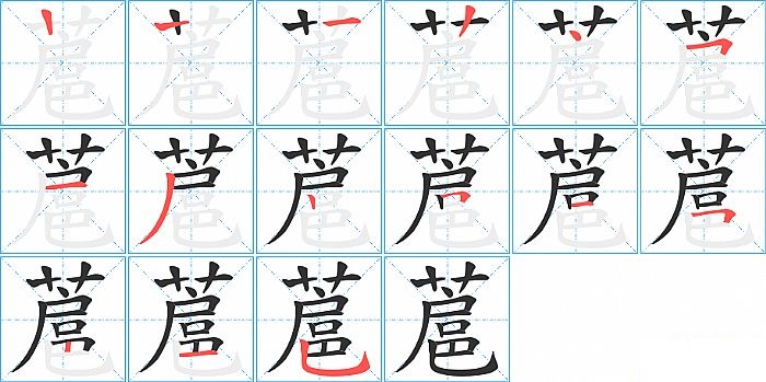 蔰是上下结构,蔰的部首是“艹”,部外笔画11画,总笔画14画,蔰的笔画顺序是“横、竖、竖、点、横折、横、撇、竖、横折、横、横折、竖、横、竖弯钩”。看看“蔰”字什么意思 >>