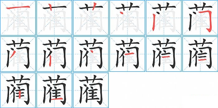 蔺是上下结构,蔺的部首是“艹”,部外笔画11画,总笔画14画,蔺的笔画顺序是“横、竖、竖、点、竖、横折钩、撇、竖、点、横、横、横、竖、横”。看看“蔺”字什么意思 >>