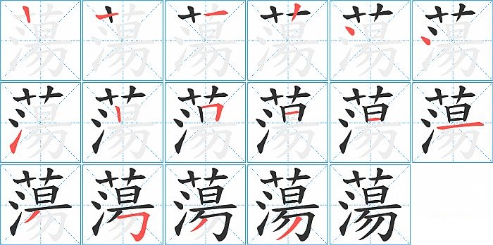 蕩是上下结构,蕩的部首是“艹”,部外笔画12画,总笔画15画,蕩的笔画顺序是“横、竖、竖、点、点、提、竖、横折、横、横、横、撇、横折钩、撇、撇”。看看“蕩”字什么意思 >>