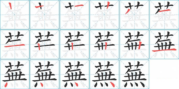 蕪是上下结构,蕪的部首是“艹”,部外笔画12画,总笔画15画,蕪的笔画顺序是“横、竖、竖、撇、横、横、竖、竖、竖、竖、横、点、点、点、点”。看看“蕪”字什么意思 >>