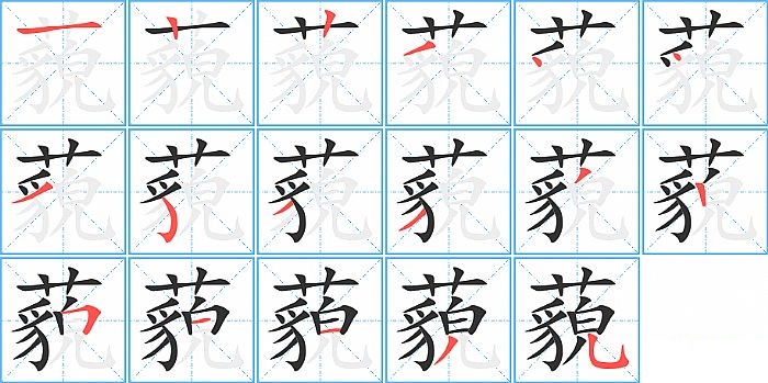 藐是上下结构,藐的部首是“艹”,部外笔画14画,总笔画17画,藐的笔画顺序是“横、竖、竖、撇、点、点、撇、弯钩、撇、撇、撇、竖、横折、横、横、撇、竖弯钩”。看看“藐”字什么意思 >>