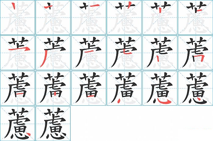 藘是上下结构,藘的部首是“艹”,部外笔画15画,总笔画18画,藘的笔画顺序是“横、竖、竖、竖、横、横撇/横钩、撇、横、竖弯钩、竖、横折、横、竖、横、点、斜钩、点、点”。看看“藘”字什么意思 >>