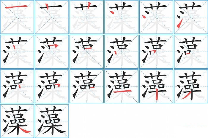 藻是上下结构,藻的部首是“艹”,部外笔画16画,总笔画19画,藻的笔画顺序是“横、竖、竖、点、点、提、竖、横折、横、竖、横折、横、竖、横折、横、横、竖、撇、捺”。看看“藻”字什么意思 >>