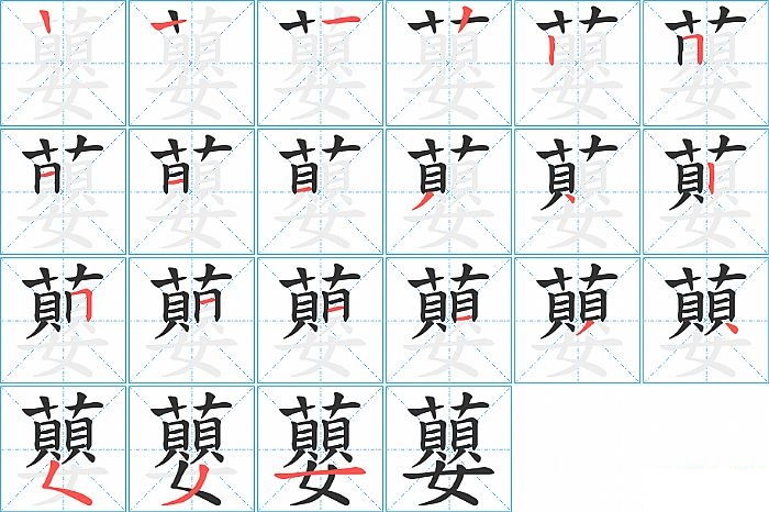 蘡是上下结构,蘡的部首是“艹”,部外笔画17画,总笔画20画,蘡的笔画顺序是“横、竖、竖、竖、横折、横、横、横、撇、点、竖、横折、横、横、横、撇、点、撇点、撇、横”。看看“蘡”字什么意思 >>