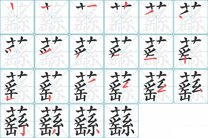 蘨是上下结构,蘨的部首是“艹”,部外笔画17画,总笔画20画,蘨的笔画顺序是“横、竖、竖、撇、点、点、撇、撇、横、横、竖、竖折/竖弯、竖、撇、撇折、撇折、点、竖钩、撇、点”。看看“蘨”字什么意思 >>