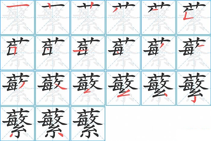 蘩是上下结构,蘩的部首是“艹”,部外笔画17画,总笔画20画,蘩的笔画顺序是“横、竖、竖、撇、横、竖折/竖弯、横折、点、横、点、撇、横、撇、捺、撇折、撇折、点、竖钩、撇、点”。看看“蘩”字什么意思 >>