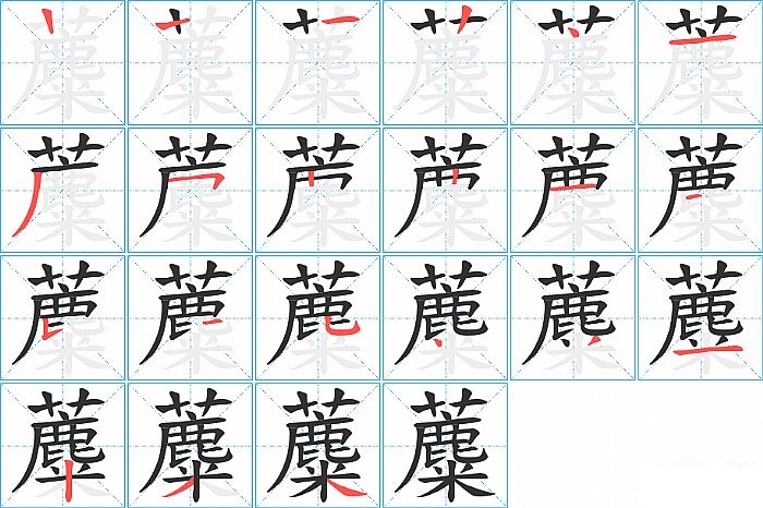 蘪是上下结构,蘪的部首是“艹”,部外笔画17画,总笔画20画,蘪的笔画顺序是“横、竖、竖、点、横、撇、横折、竖、竖、横、横、竖提、撇、竖弯钩、点、撇、横、竖、撇、捺”。看看“蘪”字什么意思 >>