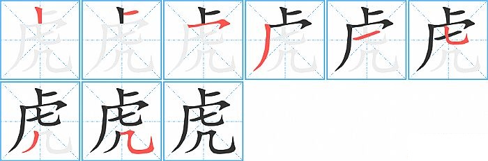 虎是半包围结构,虎的部首是“虍”,部外笔画2画,总笔画8画,虎的笔画顺序是“竖、横、横撇/横钩、撇、横、竖弯钩、撇、横折弯钩/横斜钩”。看看“虎”字什么意思 >>