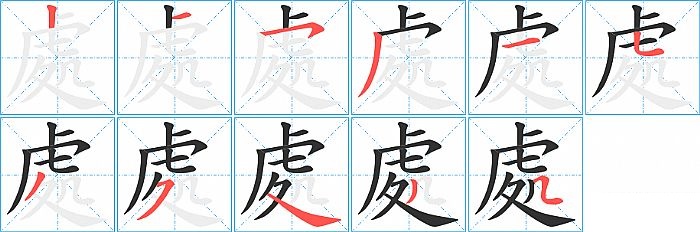 處是左上包围结构,處的部首是“虍”,部外笔画5画,总笔画11画,處的笔画顺序是“竖、横、横撇/横钩、撇、横、竖弯钩、撇、横撇/横钩、捺、撇、横折弯钩/横斜钩”。看看“處”字什么意思 >>