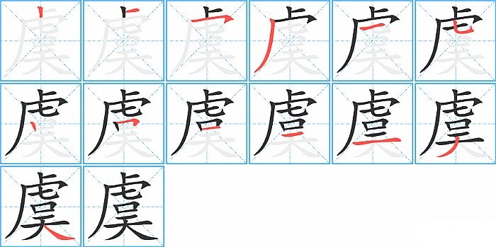 虞是半包围结构,虞的部首是“虍”,部外笔画7画,总笔画13画,虞的笔画顺序是“竖、横、横撇/横钩、撇、横、竖弯钩、竖、横折、横、横、横、撇、捺”。看看“虞”字什么意思 >>