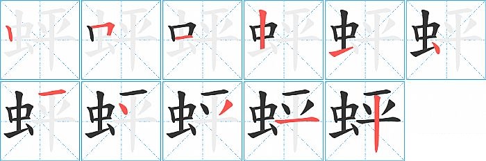 蚲是左右结构,蚲的部首是“虫”,部外笔画5画,总笔画11画,蚲的笔画顺序是“竖、横折、横、竖、横、点、横、点、撇、横、竖”。看看“蚲”字什么意思 >>