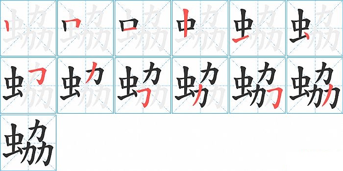 蛠是左右结构,蛠的部首是“虫”,部外笔画6画,总笔画12画,蛠的笔画顺序是“竖、横折、横、竖、横、点、横折钩、撇、横折钩、撇、横折钩、撇”。看看“蛠”字什么意思 >>