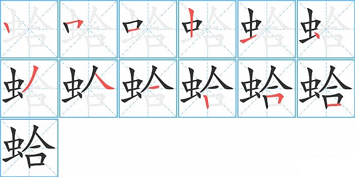 蛤是左右结构,蛤的部首是“虫”,部外笔画6画,总笔画12画,蛤的笔画顺序是“竖、横折、横、竖、横、点、撇、捺、横、竖、横折、横”。看看“蛤”字什么意思 >>