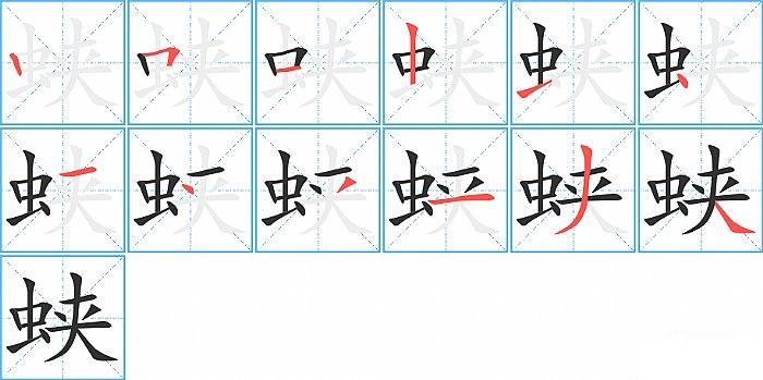 蛱是左右结构,蛱的部首是“虫”,部外笔画6画,总笔画12画,蛱的笔画顺序是“竖、横折、横、竖、横、点、横、点、撇、横、撇、捺”。看看“蛱”字什么意思 >>