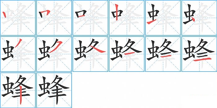 蜂是左右结构,蜂的部首是“虫”,部外笔画7画,总笔画13画,蜂的笔画顺序是“竖、横折、横、竖、横、点、撇、横撇/横钩、捺、横、横、横、竖”。看看“蜂”字什么意思 >>