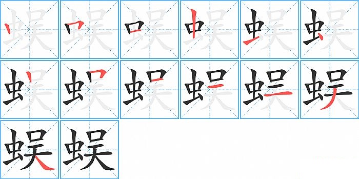 蜈是左右结构,蜈的部首是“虫”,部外笔画7画,总笔画13画,蜈的笔画顺序是“竖、横折、横、竖、横、点、竖、横折、横、横、横、撇、捺”。看看“蜈”字什么意思 >>