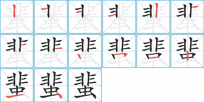 蜚是上下结构,蜚的部首是“虫”,部外笔画8画,总笔画14画,蜚的笔画顺序是“竖、横、横、横、竖、横、横、横、竖、横折、横、竖、横、点”。看看“蜚”字什么意思 >>
