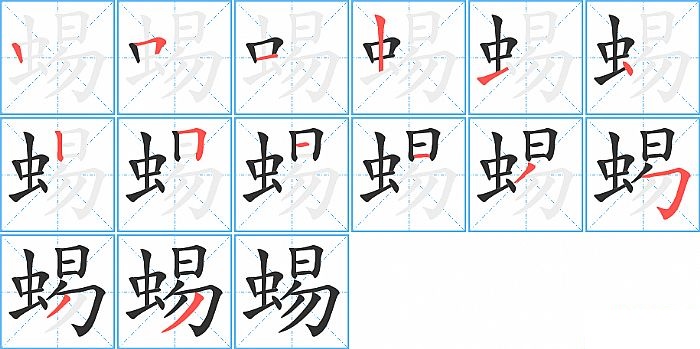 蜴是左右结构,蜴的部首是“虫”,部外笔画8画,总笔画14画,蜴的笔画顺序是“竖、横折、横、竖、横、点、竖、横折、横、横、撇、横折钩、撇、撇”。看看“蜴”字什么意思 >>
