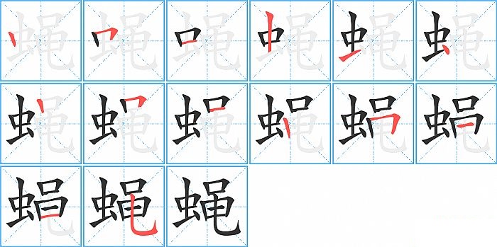 蝇是左右结构,蝇的部首是“虫”,部外笔画8画,总笔画14画,蝇的笔画顺序是“竖、横折、横、竖、横、点、竖、横折、横、竖、横折、横、横、竖弯钩”。看看“蝇”字什么意思 >>