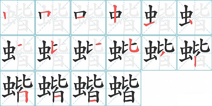 蝔是左右结构,蝔的部首是“虫”,部外笔画9画,总笔画15画,蝔的笔画顺序是“竖、横折、横、竖、横、点、横、竖提、撇、竖弯钩、撇、竖、横折、横、横”。看看“蝔”字什么意思 >>
