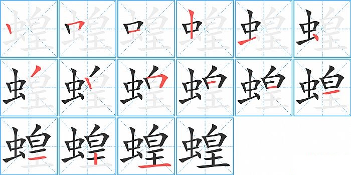 蝗是左右结构,蝗的部首是“虫”,部外笔画9画,总笔画15画,蝗的笔画顺序是“竖、横折、横、竖、横、点、撇、竖、横折、横、横、横、横、竖、横”。看看“蝗”字什么意思 >>