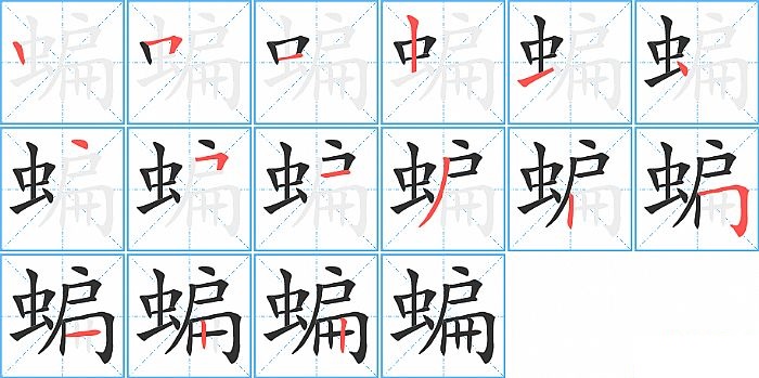 蝙是左右结构,蝙的部首是“虫”,部外笔画9画,总笔画15画,蝙的笔画顺序是“竖、横折、横、竖、横、点、点、横折、横、撇、竖、横折钩、横、竖、竖”。看看“蝙”字什么意思 >>