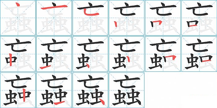 蝱是上下结构,蝱的部首是“虫”,部外笔画9画,总笔画15画,蝱的笔画顺序是“点、横、竖折/竖弯、竖、横折、横、竖、横、点、竖、横折、横、竖、横、点”。看看“蝱”字什么意思 >>