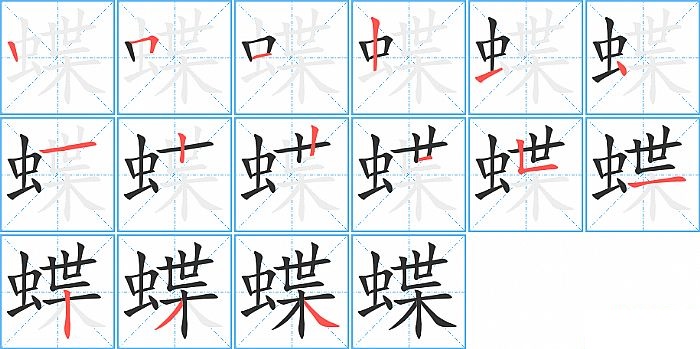 蝶是左右结构,蝶的部首是“虫”,部外笔画9画,总笔画15画,蝶的笔画顺序是“竖、横折、横、竖、横、点、横、竖、竖、横、竖折/竖弯、横、竖、撇、捺”。看看“蝶”字什么意思 >>